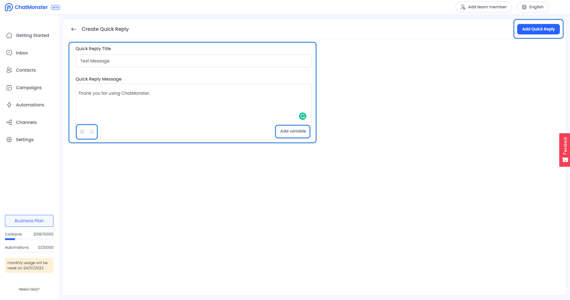 You may customize your quick reply in this section by giving it a title and your message. Feel free to add emojis or photos when useful or feel extra creative! Adding variables allows you to confirm information or deliver your message in a more friendly manner. Click "Add Quick Reply" to proceed.
